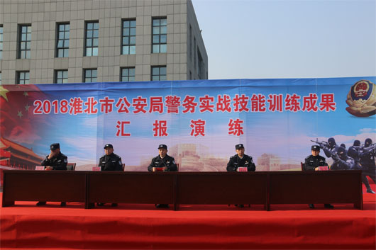 2018年12月25日上午9:25分,淮北市公安局警務(wù)實(shí)戰(zhàn)技能訓(xùn)練成果匯報(bào)表演在市交警支隊(duì)訓(xùn)練基地拉開序幕。淮北市公安局黨委書記兼公安局長章銀發(fā)以及公安局所有二級(jí)機(jī)構(gòu)人員參加。